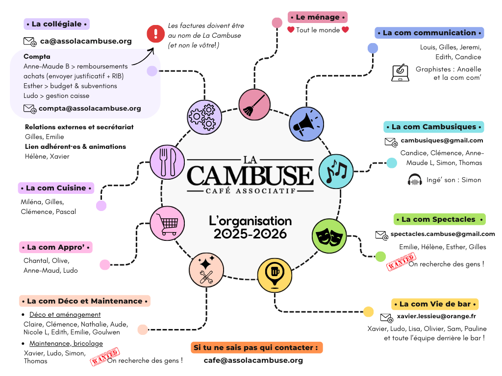 La Cambuse s’appuie sur différentes commissions afin d’organiser, de coordonner et de réaliser tous ces événements.