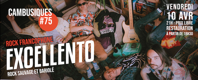 Le quatuor libère sur scène un rock sauvage et bariolé. Leurs chansons, incarnées avec une théâtralité fougueuse, portés par des musiques bien aiguisées, mêlent énergie brute et gestes habités. EXCELLENTO, dont le nom évoque un cri de guerre pour les batailles perdues d’avance, forge ainsi un univers situé quelque part entre cartoon et polar, où l’on est jamais à l’abri d’un excellent poulet frit ni de cracher des lézards…