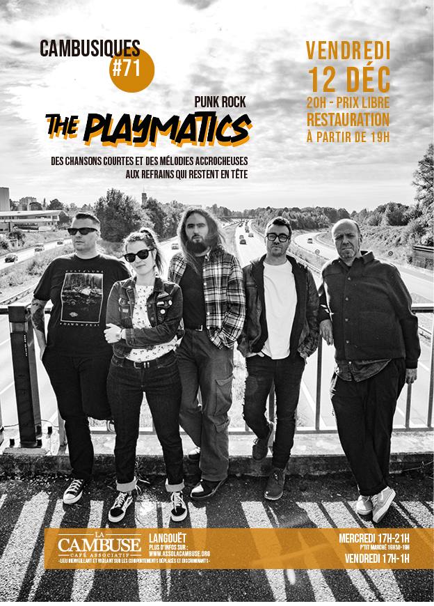 The Playmatics est un groupe de punk rock formé 2022 à Rennes. Il se compose d’anciens membres de formations punks, hardcore, noise (Faith Off, Marty Mad Fly, Navir, Halfcab, By All Means, Take Shit Back, Chère Catastrophe) avec Lisa au chant, Thomas à la basse et au chant, Fred à la batterie, Seb à la guitare et Baptiste au clavier. Influencée par la scène punk mélodique des 90’s (The Descendents, Bad Religion, The Hives, Burning Heads) mais aussi par le renouveau post-punk actuel (Radioactivity, Bad Nerves, Rotten Mind…) la musique des Playmatics suit une ligne simple: « des chansons courtes et des mélodies accrocheuses aux refrains qui restent en tête ».