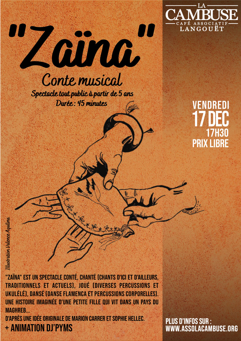 « Zaïna est un spectacle conté, chanté (chants d’ici et d’ailleurs, traditionnels et actuels), joué (diverses percussions et ukulélé), dansé (danse flamenca et percussions corporelles). Une histoire imaginée d’une petite fille qui vit dans un pays du Maghreb… »